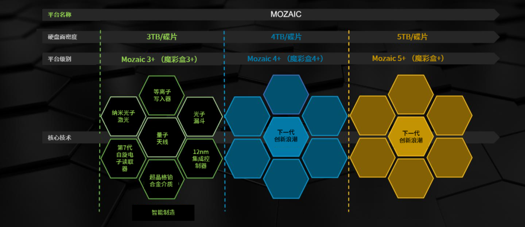 Mozaic 3+™(魔彩盒3+)平台,搭载领先的热辅助磁记录(HAMR)技术。该平台标志着单碟片面密度达到了前所未有的3TB+,并在未来几年内将实现单碟4TB+和5TB+的发展路线图。